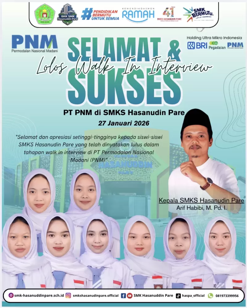 Selamat dan Sukses Kepada Siswi yang telah dinyatakan lulus dalam proses Rekrutmen PT PNM di SMKS Hasanudin Pare, Lihat DISINI!!